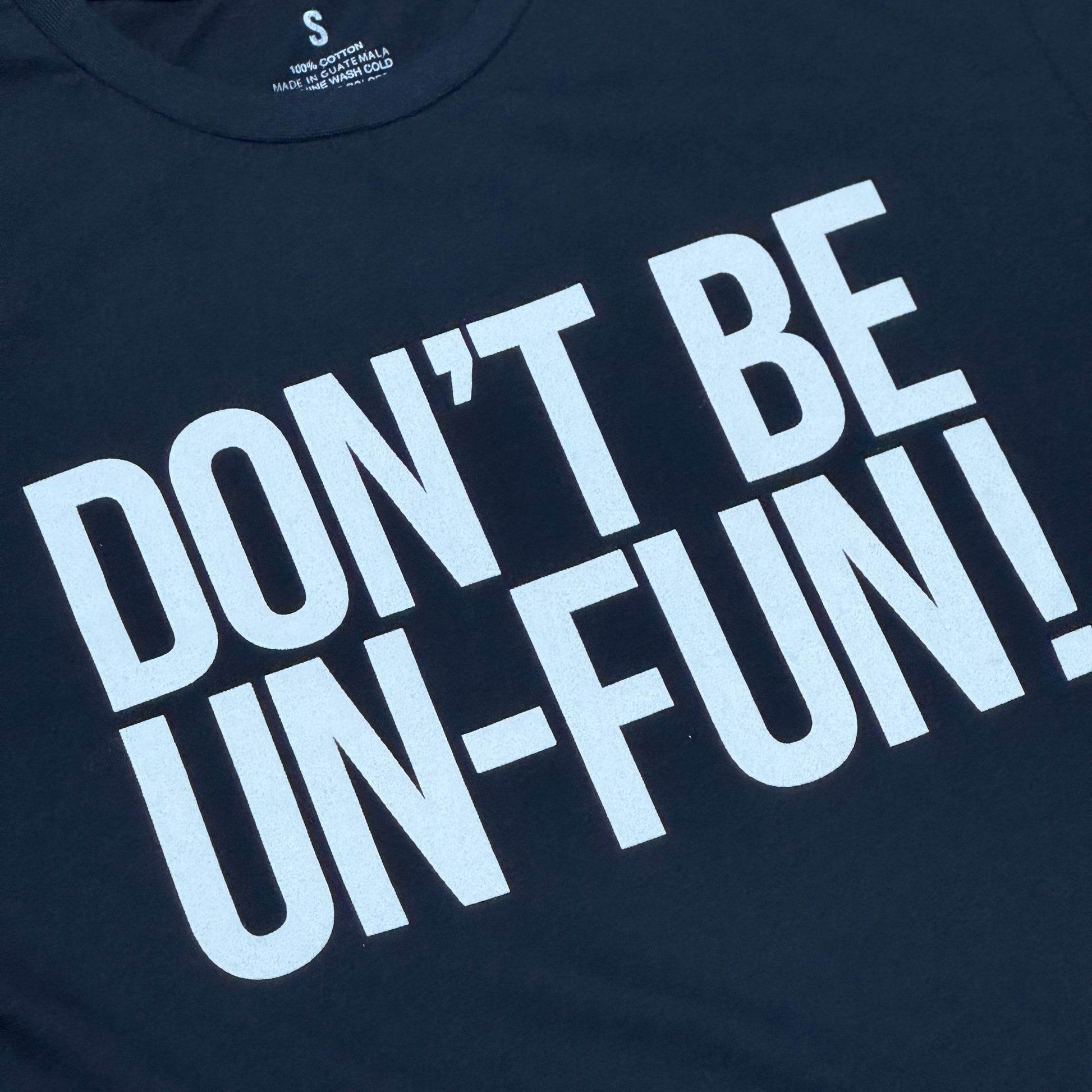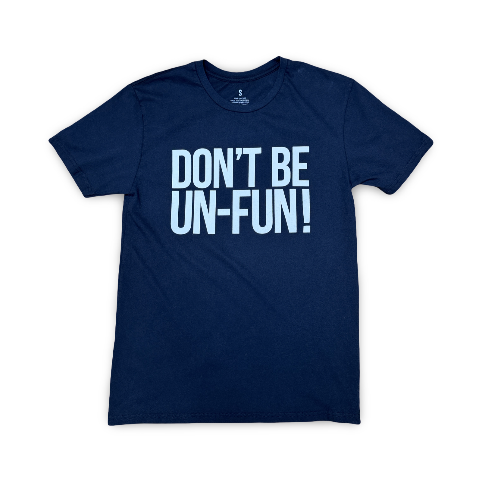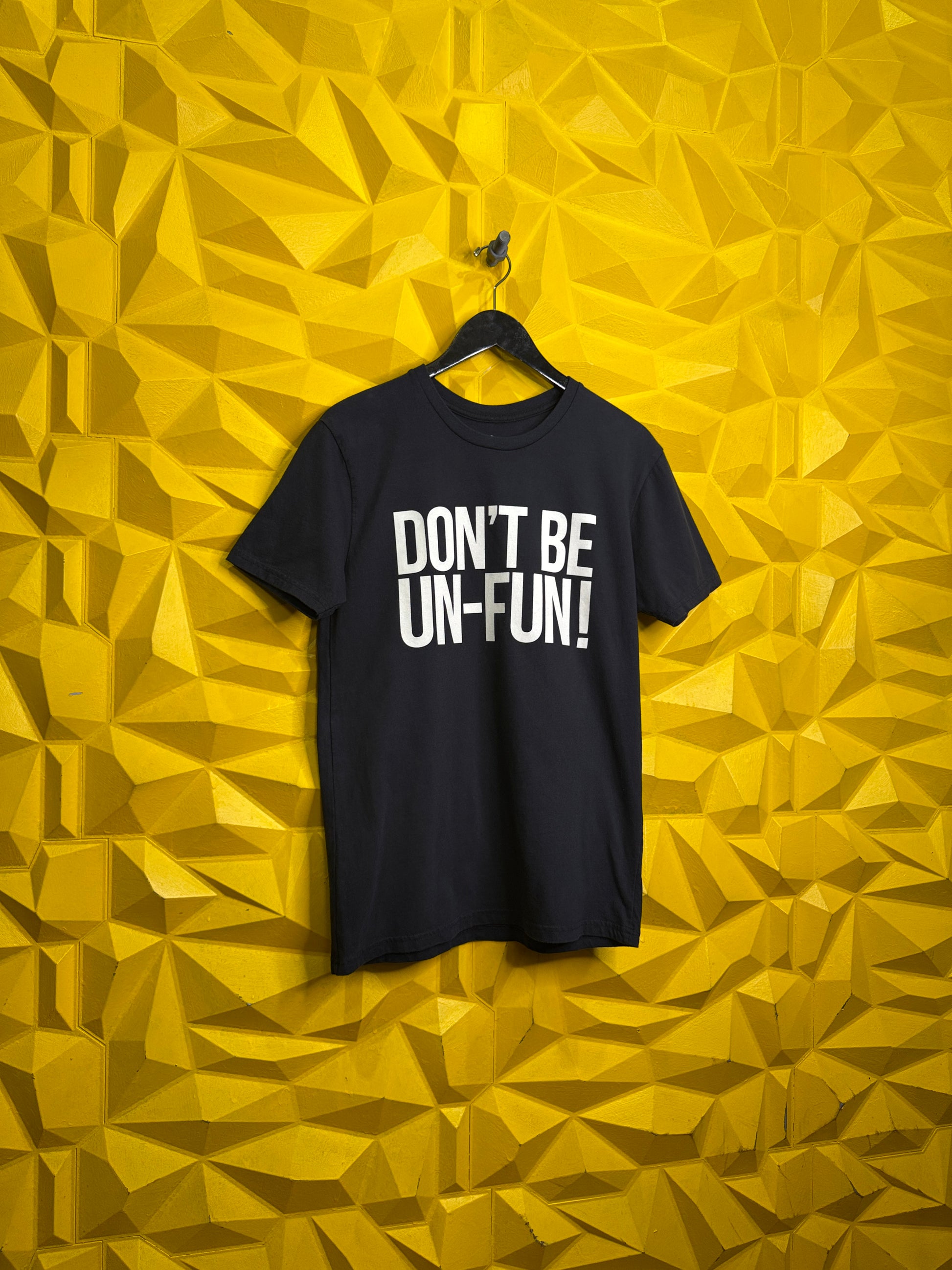 # Don't Be Un-Fun ! Tee Life's too short for boring basics. This tee delivers comfort without compromise—premium fabric that moves with you, a fit that works for any occasion, and a message that says you've got personality. Whether you're heading out or staying in, wear something that reflects your vibe. Because fun isn't optional, it's essential.100% Screen print front and back graphic.